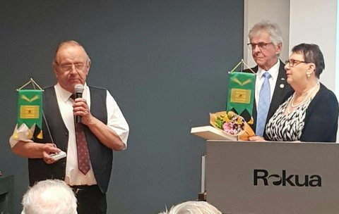 Raimo Määtälle luovutetaan sukuseuran viiri, avokkaasta työstä sukuseuran hyväksi